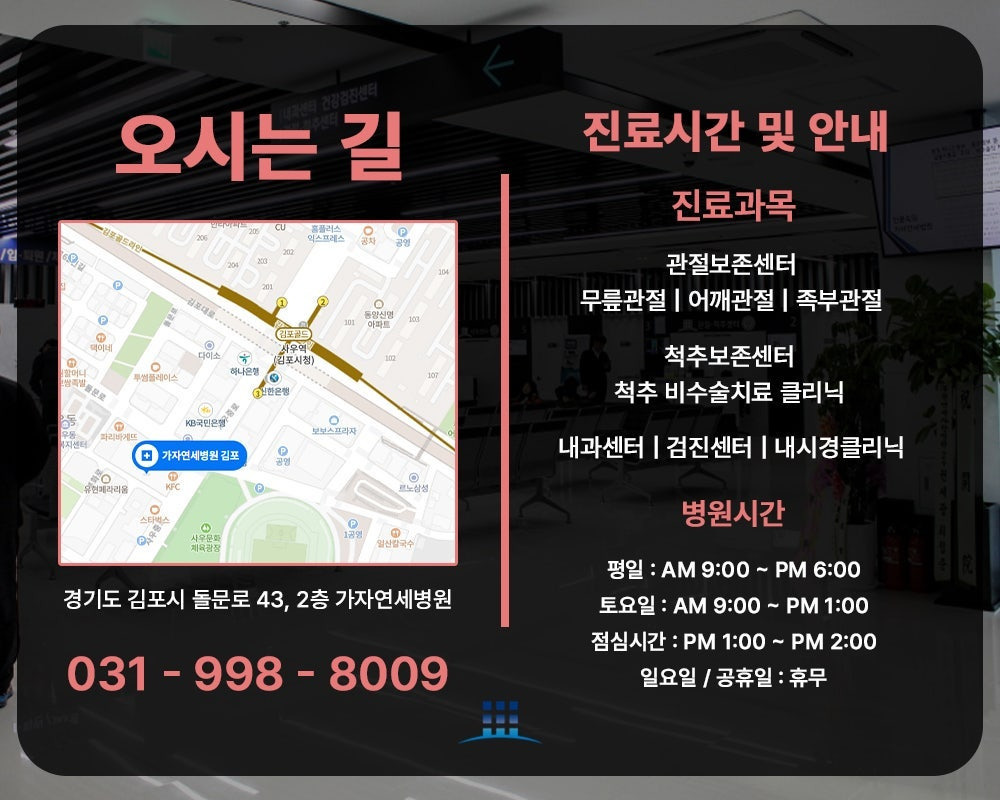 김포도수치료를 고민하고 계시다면, 풍부한 임상 경험과 체계적인 도수치료 시스템을 갖춘 김포가자연세병원에서 정확한 진단과 적절한 치료를 받아보시길 바랍니다.