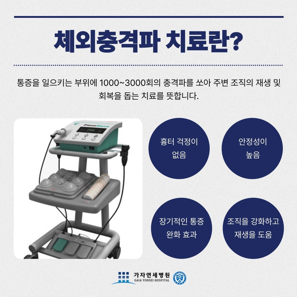 이 치료는 통증이 있는 힘줄 부위에 고강도의 충격파를 전달하여 혈류를 증가시키고, 손상된 조직의 재생을 촉진하는 원리로 진행됩니다. 체외충격파 치료의 장점은 다음과 같습니다.