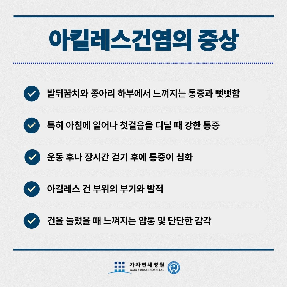 특히 아침 기상 직후 통증이 심하다가, 조금 걸으면 풀리는 듯한 증상이 있다면 아킬레스건염을 의심해볼 수 있습니다.