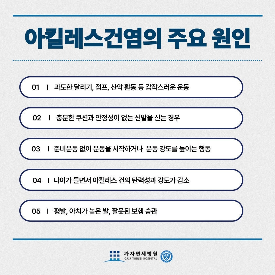 평발, 발 아치의 과도한 높이 등 발의 구조적 이상이 있는 경우 아킬레스건에 반복적인 스트레스를 유발합니다.