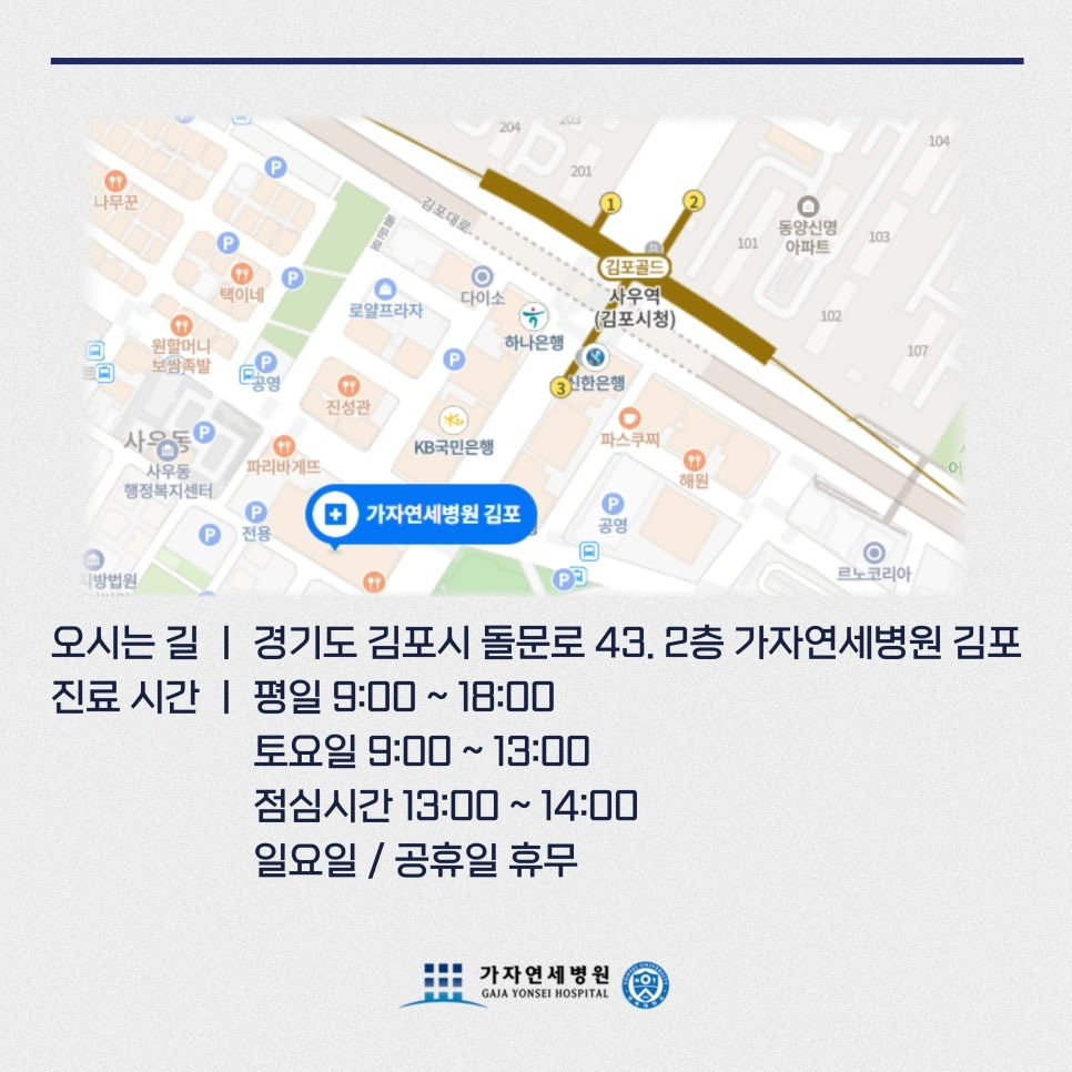 김포물리치료가 필요한 환자라면, 다양한 진단 및 치료 경험을 바탕으로 환자 맞춤형 치료를 제공하는 김포가자연세병원에서 상담을 받아보시는 것을 권장드립니다. 체계적인 검사와 생활습관 교정, 물리치료, 재활 프로그램, 체외충격파 치료까지 다양한 방법을 통해 환자의 빠른 회복을 돕고 있습니다.