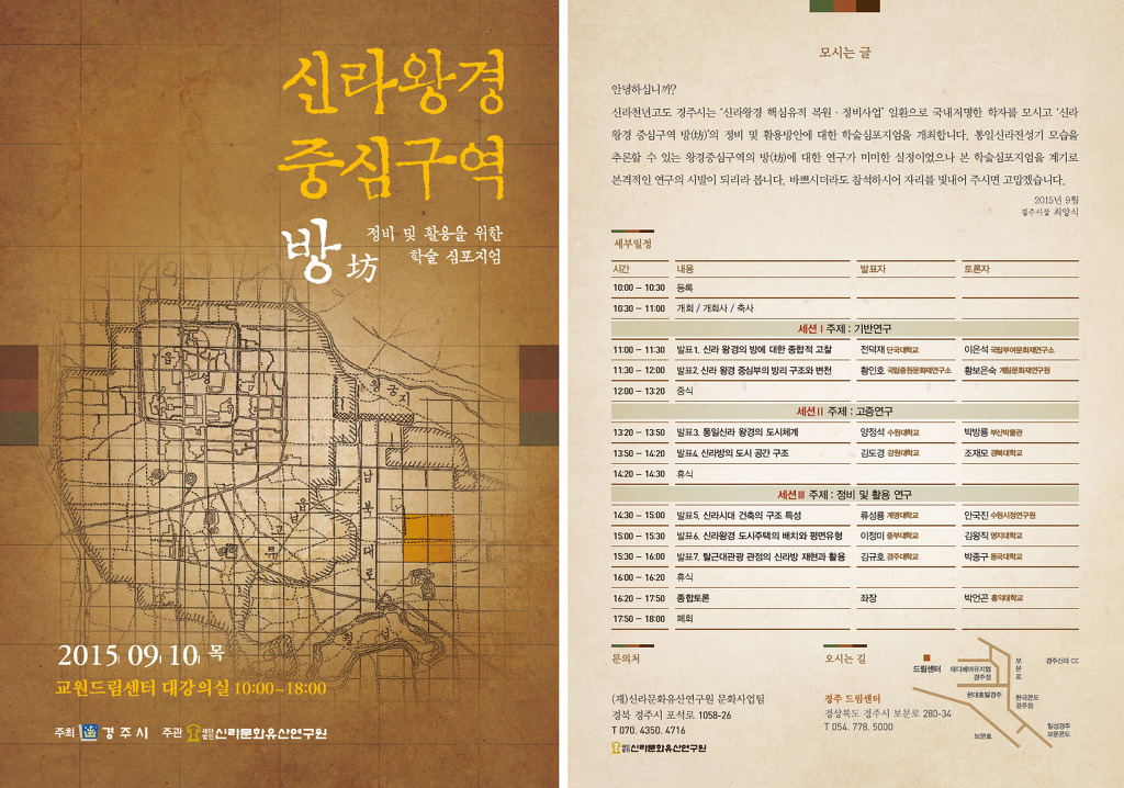 신라천년고도 경주시는 ‘신라왕경 핵심유적 복원·정비사업’ 일환으로 국내저명한 학자를 모시고 ‘신라왕경 중심구역 방(坊)’의 정비 및 활용방안에 대한 학술심포지엄을 개최합니다. 통일신라전성기 모습을 추론할 수 있는 왕경중심구역의 방(坊)에 대한 연구가 미미한 실정이었으나 본 학술심포지엄을 계기로 본격적인 연구의 시발이 되리라 봅니다. 바쁘시더라도 참석하시어 자리를 빛내어 주시면 고맙겠습니다.