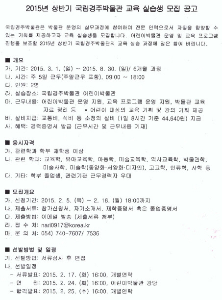 [고함★]2015년 상반기 국립경주박물관 교육 실습생 모집 공고 작성자학사조교 임지현|작성시간15.02.10|조회수105 목록 댓글 0 글자크기 작게가 글자크기 크게가 참가 신청서.jpg 자기소개서.jpg 첨부파일첨부된 파일이 3개 있습니다. jpg 파일 경주박물관 어린이박물관 모집 공고.jpg 다운로드 jpg 파일 참가 신청서.jpg 다운로드 jpg 파일 자기소개서.jpg 다운로드 다음검색 현재 게시글 추가 기능 열기 북마크 신고 센터로 신고 댓글 댓글 0 댓글쓰기 답글쓰기 댓글 리스트