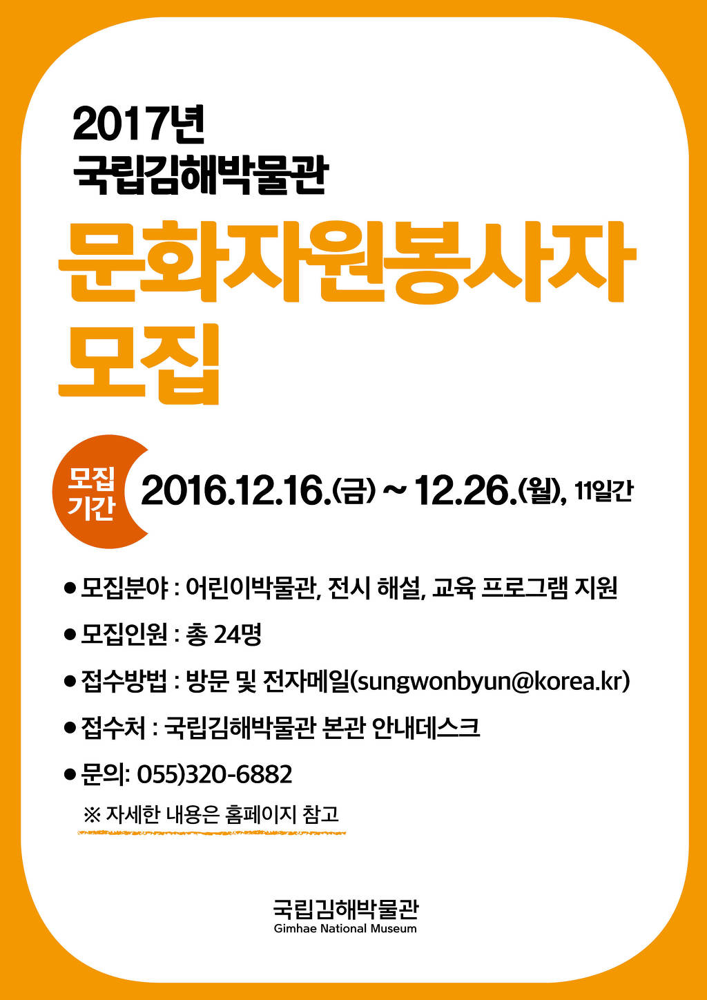 [- 자원봉사]2017년 국립김해박물관 문화자원봉사자 모집 공고 작성자학사조교 임지현|작성시간16.12.22|조회수166 목록 댓글 0 글자크기 작게가 글자크기 크게가 2017년 자원봉사자 모집 공고.hwp 첨부파일첨부된 파일이 2개 있습니다. jpg 파일 문화자원봉사자모집 포스터.jpg 다운로드 hwp 파일 2017년 자원봉사자 모집 공고.hwp 다운로드 다음검색 현재 게시글 추가 기능 열기 북마크 신고 센터로 신고 댓글 댓글 0 댓글쓰기 답글쓰기 댓글 리스트