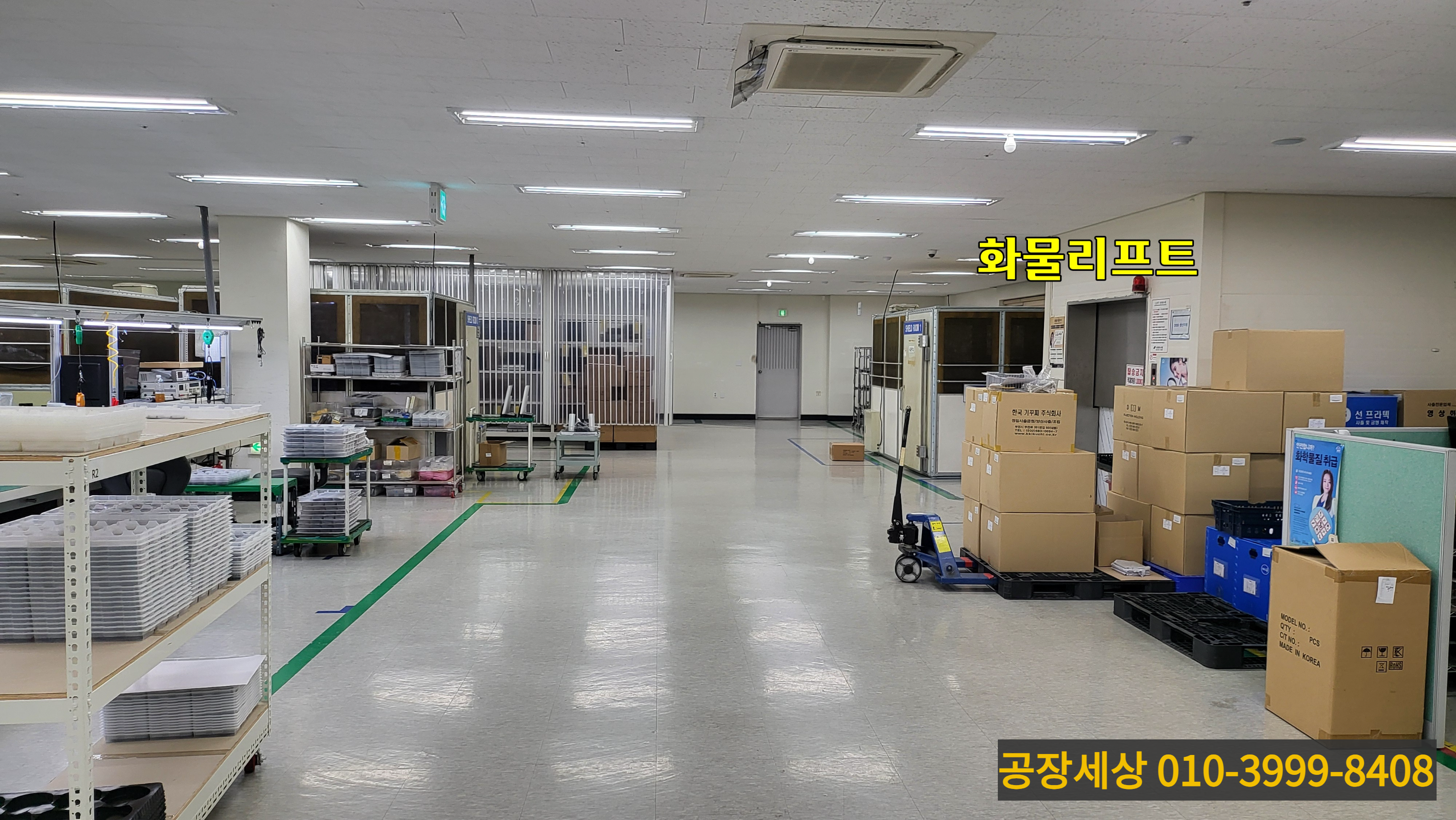 공장은 앞쪽으로 엘리베이터가 설치되어 있고 공장의 후면쪽으로 인승 및 화물 겸용엘리베이터등 엘리베이터가 2기 설치되어 있습니다.