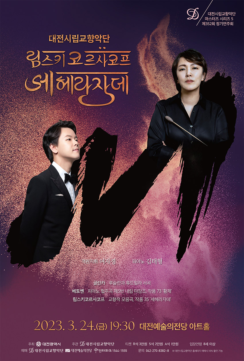 □ 대전시립교향악단은 3월 24일(금) 저녁 7시 30분, 대전예술의전당 아트홀에서 ‘마스터즈 시리즈 5 림스키코르사코프 세헤라자데’를 연주한다.