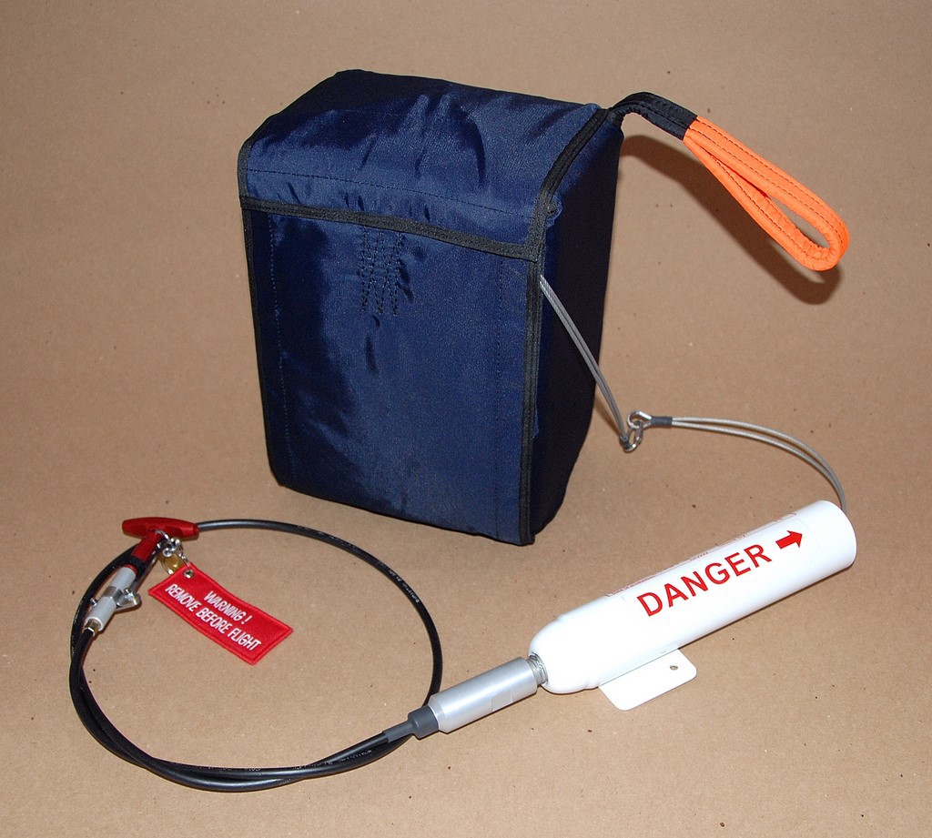 아래 사진도 위의 비상낙하산과 유사한 모양인데 배낭 같은 부분이 낙하산이 들어있는 Container이고 Danger라고 쓰여진 하얀 씰린더 모양이 로켓입니다.