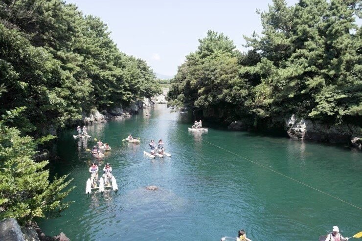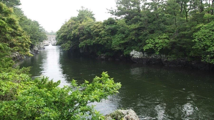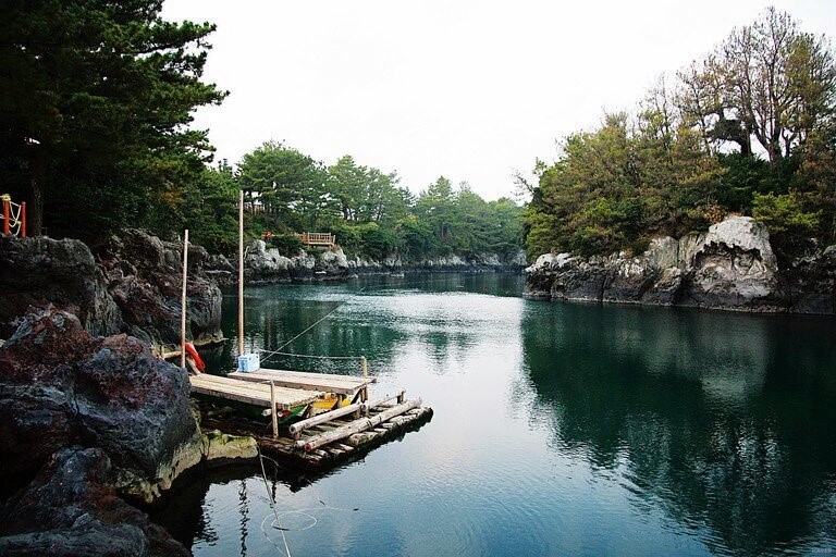 쇠소깍이란 발음하기도 힘든 이름은 ‘소가 누워 있는 모습의 연못’이라는 뜻의 ‘쇠소’에 마지막을 의미하는 ‘깍’이 더해진 제주 방언이다. 한라산에서 흘러내려온 물줄기가 제주도 남쪽으로 흐른다는 효돈천의 마지막 자락은 최근까지 제대로 알려지지 않은 숨은 비경이었다. 민물과 바닷물이 합쳐지는 계곡은 그 입구를 막아 천일염을 얻어내는 염전으로도 사용되었다. 미국의 그랜드캐니언을 축소한 듯한 메마른 계곡을 따라 바다로 향하면 끝자락으로 기암괴석과 우거진 숲이 어우러지는 절경이 나타난다. 바위에 비추어지는 민물과 바닷물이 어울리는 빛깔은 유난히 푸르고 맑다. 깊은 속을 그대로 비추는 계곡 바위틈으로 썰물 때면 솟아오르는 지하수의 신기한 경관도 바라볼 수 있다. 이곳은 가뭄을 해소하는 기우제를 지냈던 신성한 땅으로 함부로 돌을 던지거나 물놀이를 하지 못하였다. 계곡 주변을 이어가는 정돈된 산책로를 따라 경관을 관찰하는 것도 좋지만 무엇보다 이곳을 특별하게 만드는 것은 제주 전통 목선 ‘테우’를 직접 타보는 것이다. 효돈리마을 청년회에서 운영하는 테우는 물에 절인 나무를 이어 만든 뗏목처럼 생긴 조각배다. 별도의 동력도 없이 사람의 힘과 바람으로 항해하는 배가 위태로워 보이지만 바람과 해류에 익숙한 현지인들에겐 제주도와 외부를 잇는 무역선이기도 하였다. 비록 밧줄에 묶인 배를 타는 30여 분의 짧은 승선이지만 쇠소깍의 전설을 들으며 경관을 감상하는 느낌은 여느 곳에서 즐길 수 없는 특별함이 있다.
