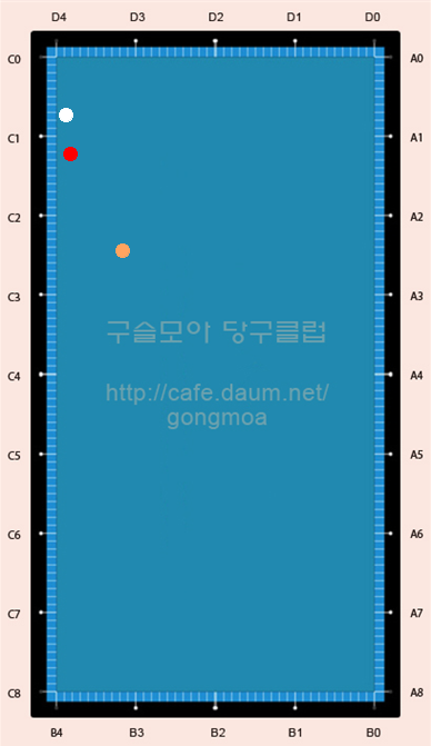 작성자블루진 작성시간 15.02.07 기상천외한 샷이니깐......빨 - C - (흰공그자리에있을때,빨공이 B맞고와서 흰공키스내고나가면서) - D - C - 놀공