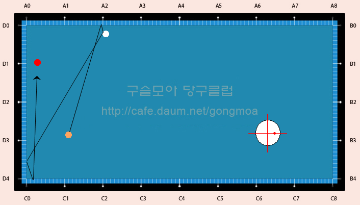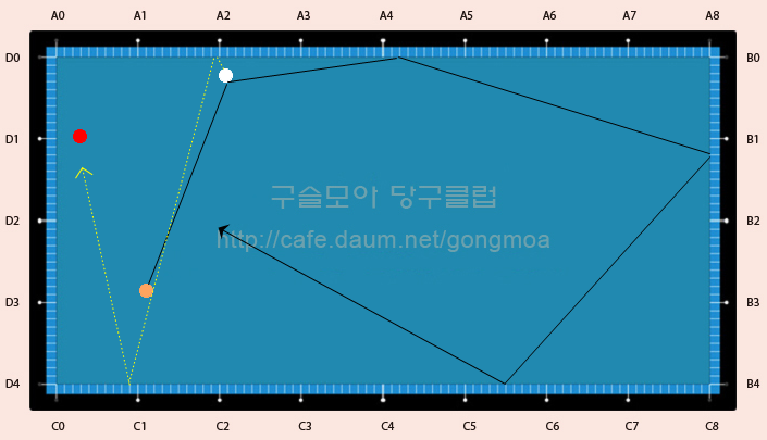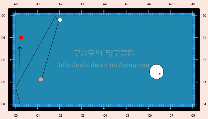 이 그림은 강하게 쳐서 2쿠션째를 D쪽 레일에 도착만 시키면,