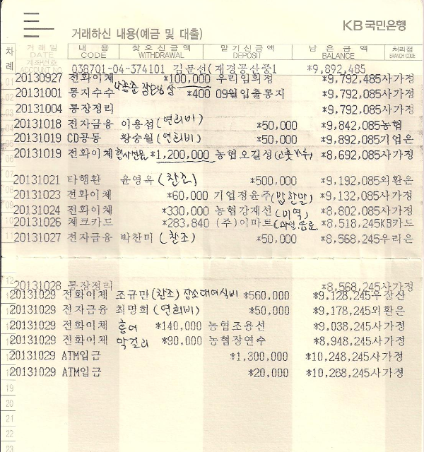 9월 27일 잔액 : 9,782,485 연회비 추가 납부인원 5명 : + 250,000 회비 잔액 : + 226,160 이자 및 수수료 : +- 9,600 현 잔액 : 10,268,245 | ||