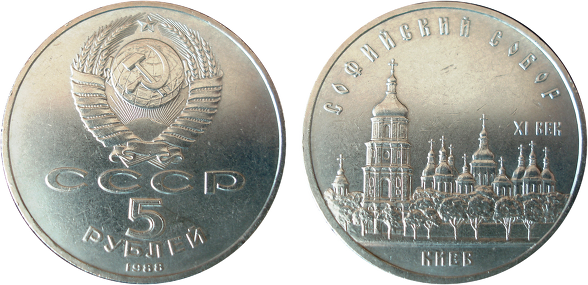 1988년 구 소련 중앙은행이 발행한 소피아 성당 기념주화(5루불, 직경 3.5 Cm)