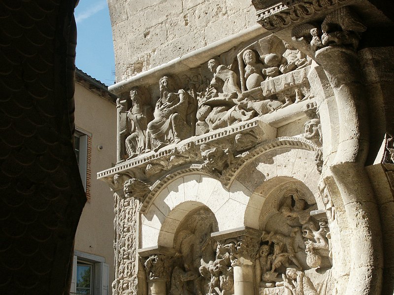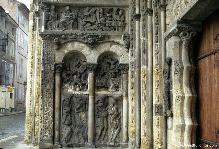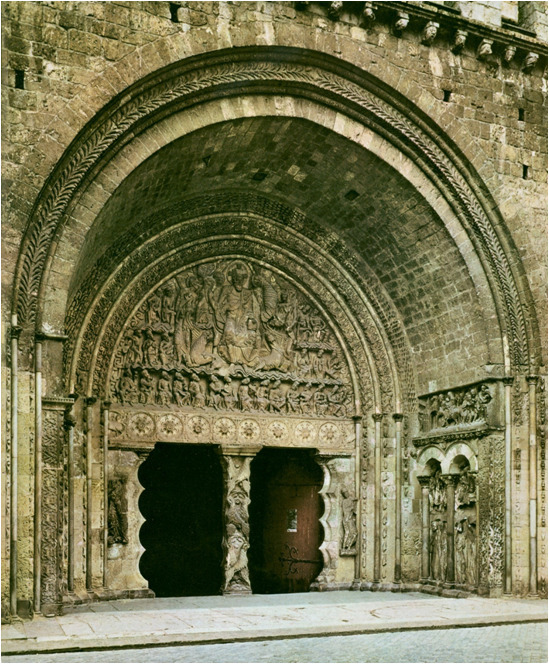 생 피에르의 정문 구조는 전성기 로마네스크 양식에 전형적인 형태를 띠고 있다.