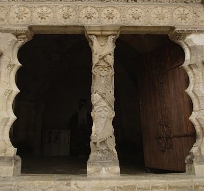식물 장식이 새겨져 있고, 아래의 상인방에는 메달 모양의 원들이 장식 되어 있고