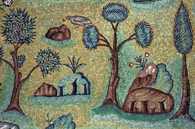 Among the greenery are pine trees, which can still be seen growing outside the church.