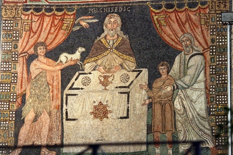 Abel with his perfect lamb, Melchizedek at a table with his bread,