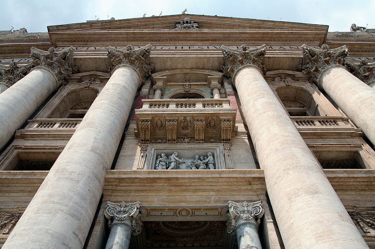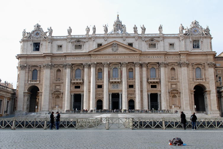 1,506년 4월 18일 율리우스2세(Julius II)가 새 바실리카(Bazilika)를 위한 초석을 놓았고 건물은 '도나토 브라만테(Donato Bramante)'가 설계한 평면에 따라 그리스 십자형 평면으로 건립하기로 했다.