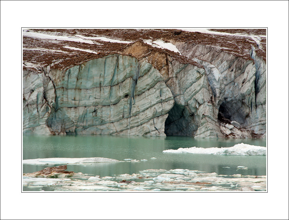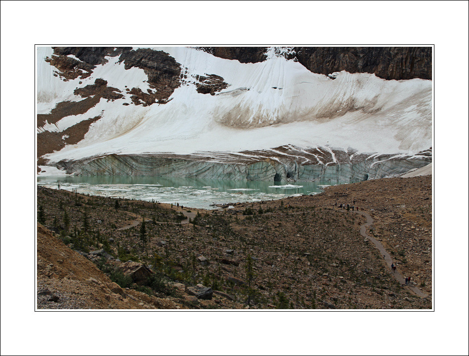 Edith Cavell 산 아래는 카벨 빙하(Cacell Gracier)눈부시게 푸른 빛을 띄고 빛납니다, 그 아래 Cavell Pond에는 빙하에서 떨어져 나온 얼음조각들이 둥둥 떠다닙니다