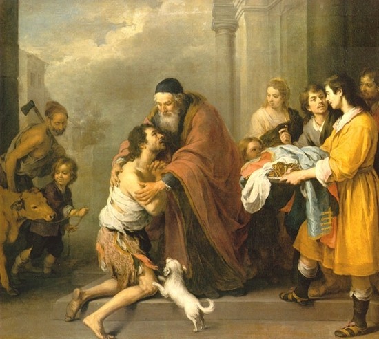 The Return of the Prodigal Son (1773) oil on canvas Kunsthistorisches Museum, Vienna Bartolomé Esteban Murillo. The Return of the Prodigal Son. 1670-74. Oil on canvas. The National Gallery of Art, Washington, DC, USA. 방탕한 아들 그런데 작은 아들이 아버지에게 자기 몫의 유산을 미리 요구했고, 유산을 챙긴 작은 아들은 고향을 떠났다. 그리고 그곳에서 방종한 생활을 하며 재산을 탕진하였다. 곤궁에 허덕이던 그는 돼지를 치게 되었고, 돼지들이 먹는 열매 꼬투리라도 배를 채우길 간절히 바랬지만, 아무도 주지 않았다. 그제야 제정신이 든 그는 회개하고 아버지의 집으로 돌아간다. 멀리서 아들을 본 아버지는 달려가 아들의 목을 껴안고 입을 맞추었다. 아들은 아버지에게 “아버지, 제가 하늘과 아버지께 죄를 지었습니다. 저는 아버지의 아들이라 불릴 자격이 없습니다.”고 말했다. 그러나 아버지는 아들에게 가장 좋은 옷을 가져다 입히고 즐거운 잔치를 벌였다. 그때 들에 나가있던 큰 아들이 집으로 돌아와 “저는 여러해 동안 종처럼 아버지를 섬기며 아버지의 명을 한 번도 어기지 않았습니다. 이러한 저에게 아버지는 친구들과 즐기라고 염소 한 마리 주신 적이 없습니다. 그런데 창녀들과 어울려 아버지의 가산을 들어먹은 저 아들이 오니까 살진 송아지를 잡아 주시는 군요” 라며 화를 낸다. 아버지는 “얘야, 너는 늘 나와 함께 있고 내 것이 다 네 것이다. 너의 저 아우는 죽었다가 다시 살아났고 내가 잃었다가 되찾았다. 그러니 즐기고 기뻐해야 한다.” (누가 15:1~-32 요약) 매우 시적이고도 심리적 통찰력이 뛰어난 일화이다. 흥미로운 이야기 전개와 방탕한 아들, 자비로운 아버지, 모범적인 아들이 엮어내는 분명한 갈등은 미술가들의 상상력을 자극하기에 충분했고, 그 이미지는 중세부터 나타나기 시작한다.