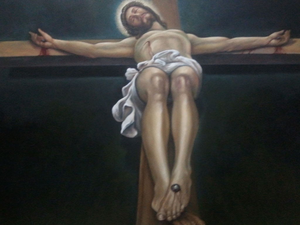 두 발이 각각의 발판 위에 못 박히고, 머리에는 윤광(輪光)을 두른