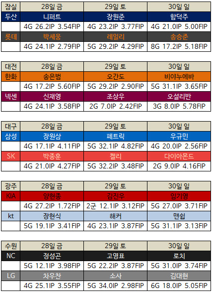 [출처] 4/28~4/30 선발 매치업 예상 (최근 한 달간 FIP 비교)|작성자 마플