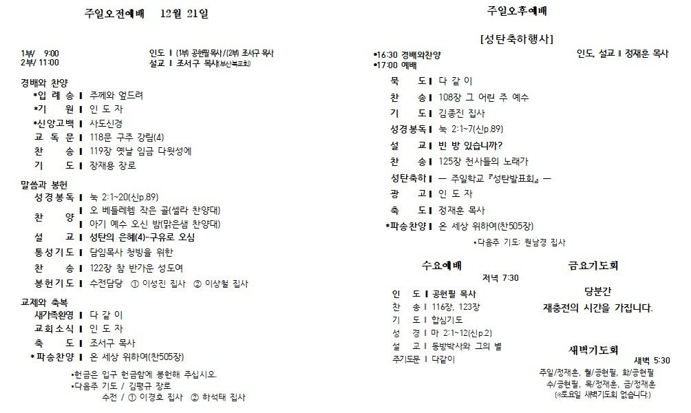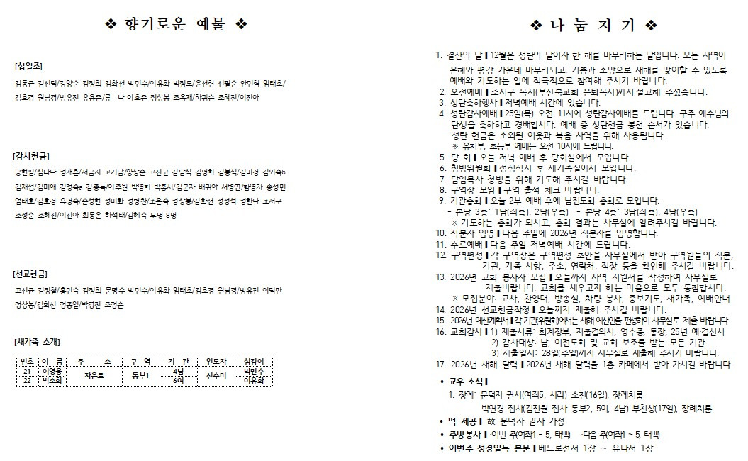 2025.12.21 교회주보입니다 작성자사무 간사|작성시간25.12.20|조회수329 목록 댓글 0 글자크기 작게가 글자크기 크게가 다음검색 현재 게시글 추가 기능 열기 북마크 신고 센터로 신고 댓글 댓글 0 댓글쓰기 답글쓰기 댓글 리스트