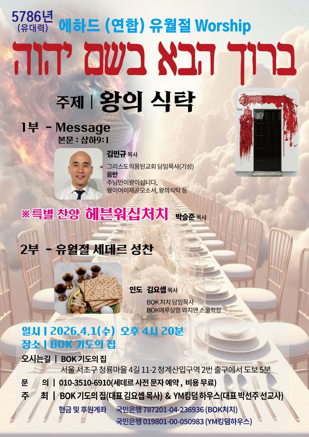 5786년 유월절(pass over)을 맞아 YM킹덤하우스와 BOK 기도의 집, 헤븐워십처치, 그리스도의 몸된 교회가 함께 에하드(연합)로 주님께 영광스런 예배를 올려드립니다.