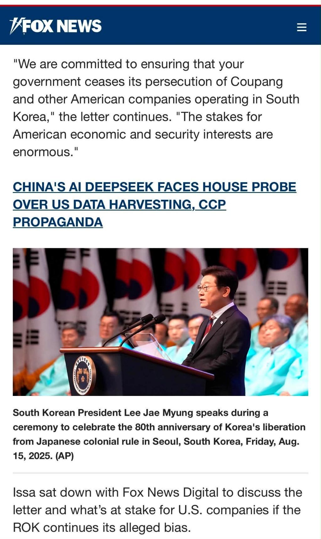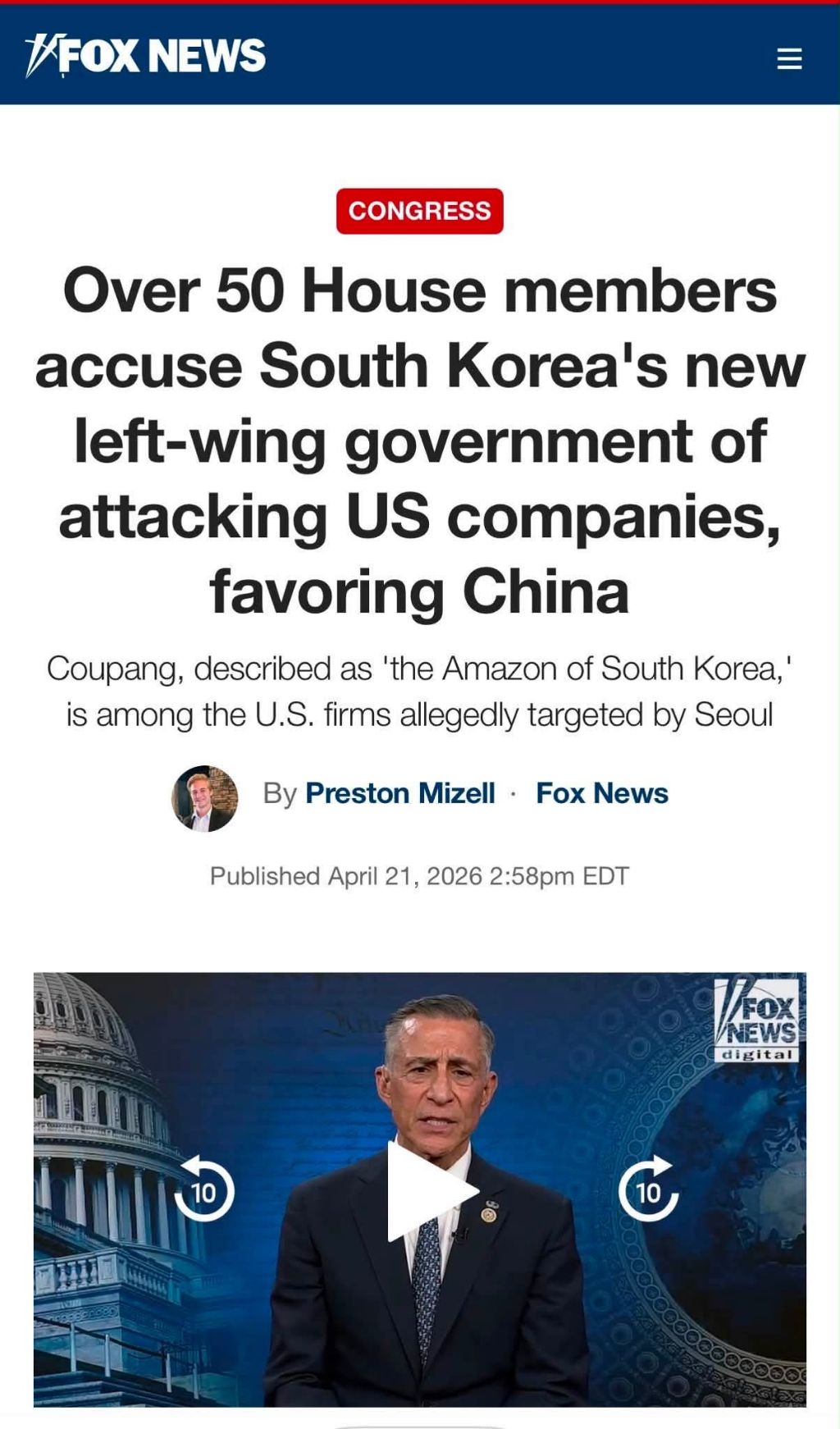 50여 미 하원 의원들, "한국의 새로운 좌익 정부가 미국 기업을 공격하고 중국을 편들고 있다'고 공개적으로 비판