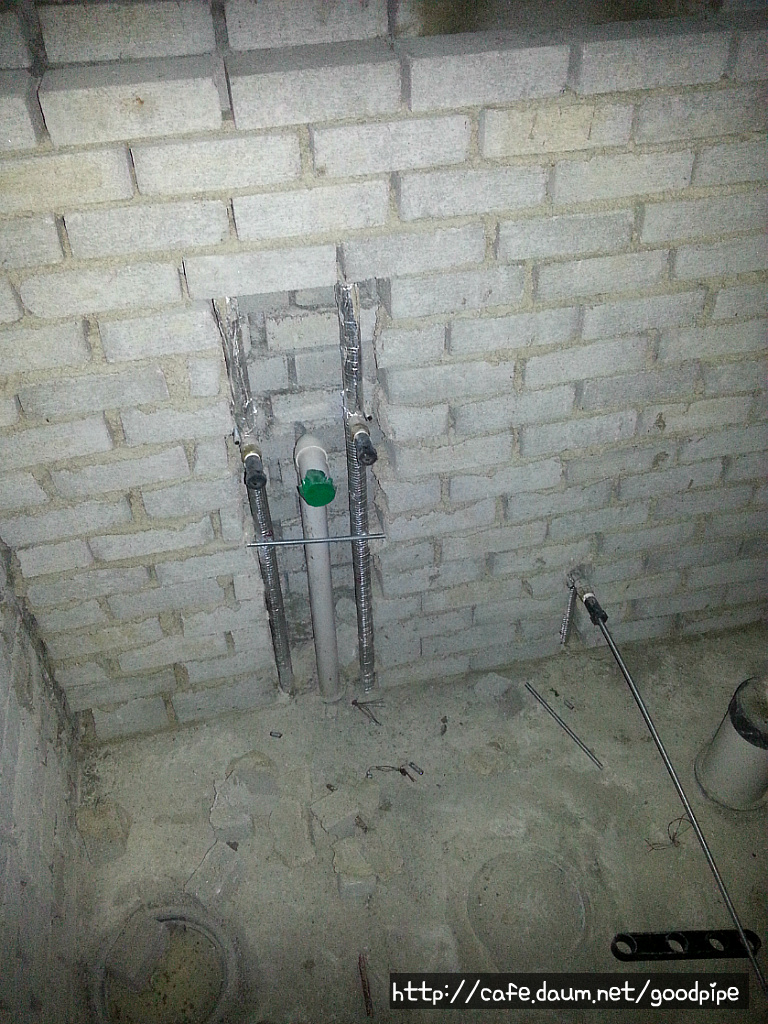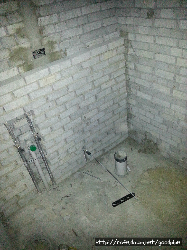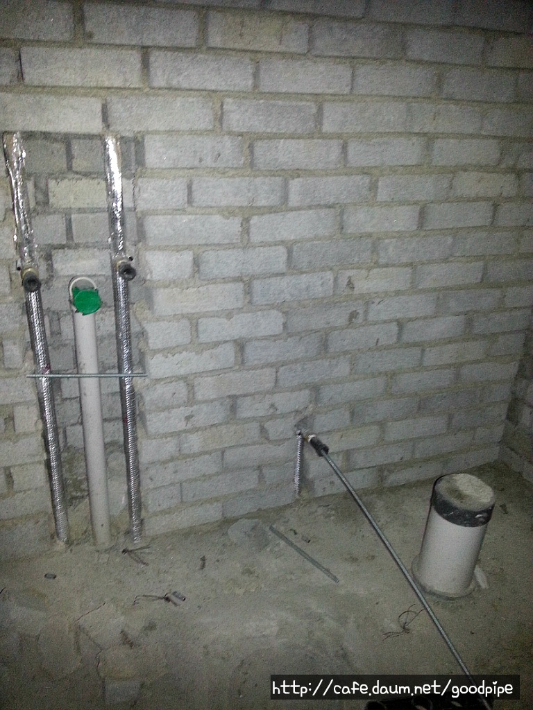 벽돌조적면에 배관후 몰탈로 땜방시공후 습식방수를 합니다.