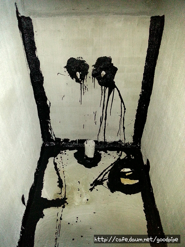 세면기 벽체 급수배수배관 시공후 몰탈땜방후 습식방수하고 우레탄 방수처리한 모습입니다.