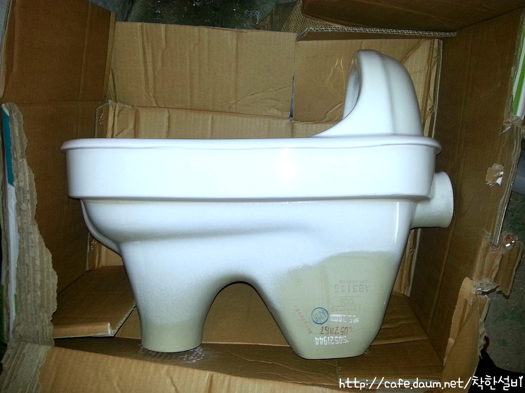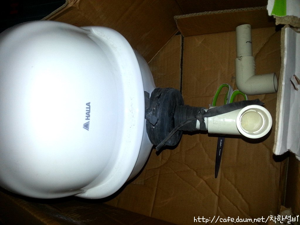 화변기의 앞부분은 세척수가 들어 가는쪽으로써 부속을 써서 다음과 같이 pvc 엘보를 사용후 올려놓은 모습입니다.