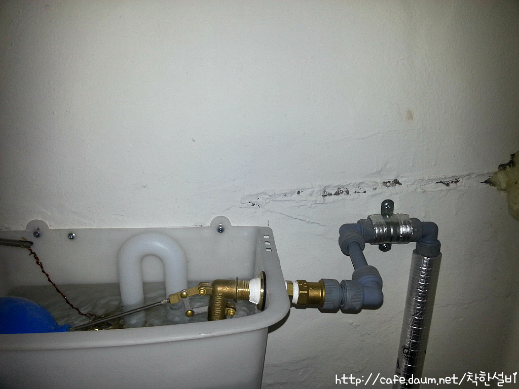 아래 배수관도 연결하고 옆면에 급수관도 미리 급수라인 밸브에서 시작해서 배관을 올려 볼탑으로 배관을 연결합니다.