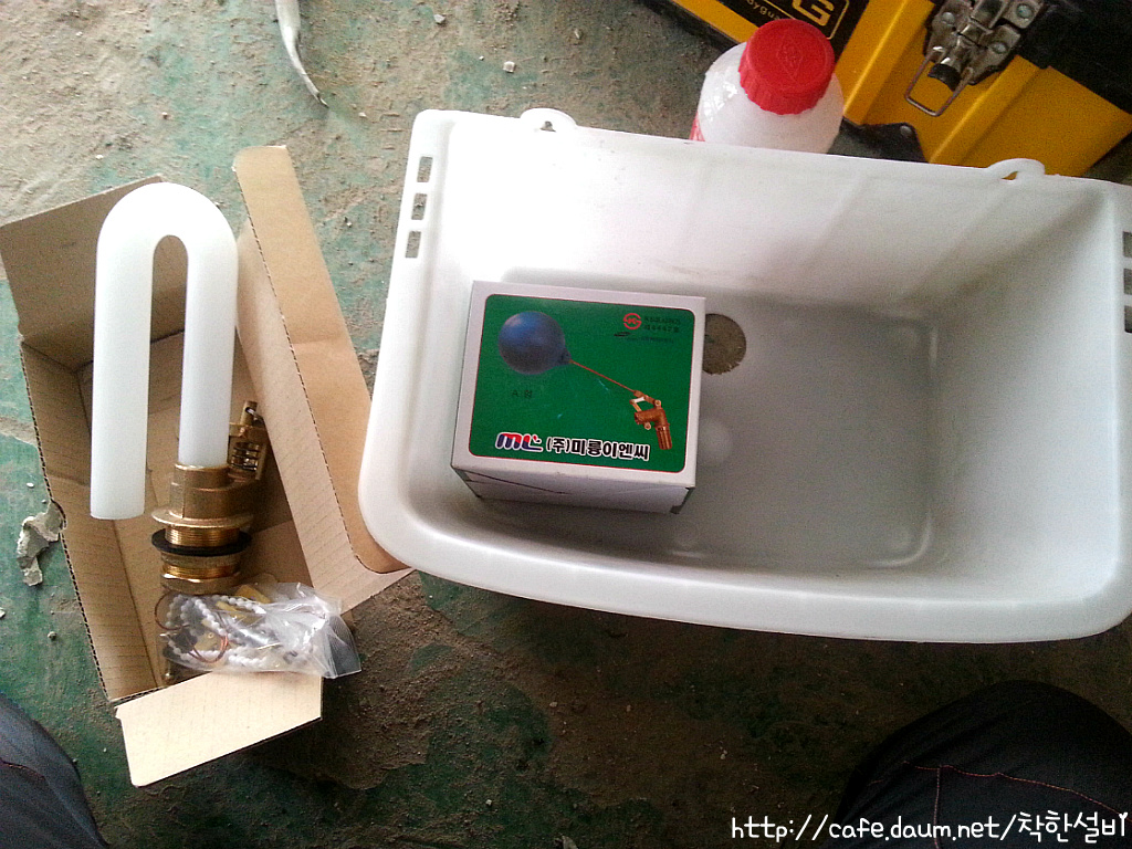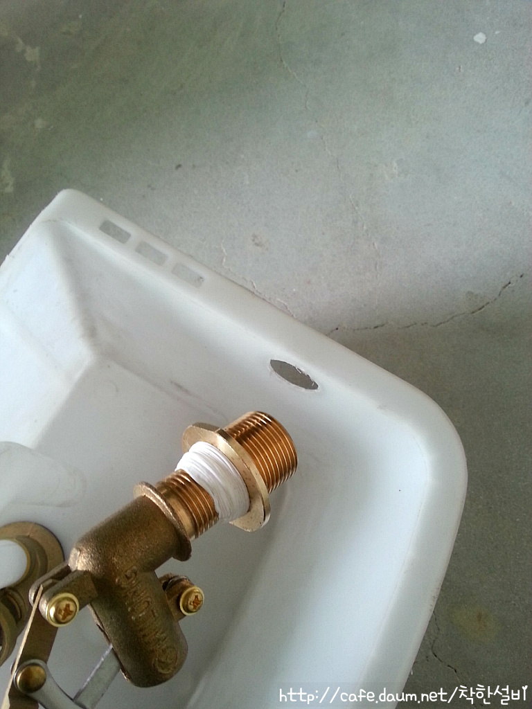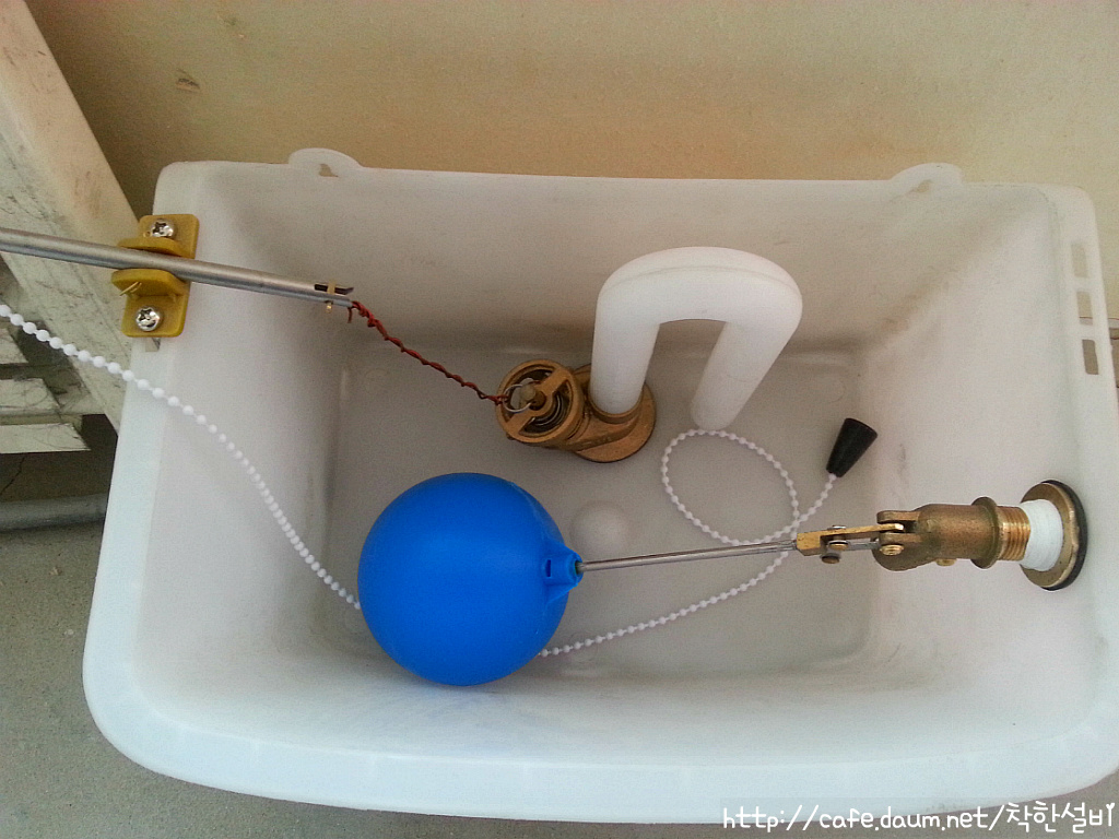 통의 가운데 구멍에 U자 형태의 부속을 고무를 잘 끼워서 조립하고 별도로 통 옆에에 구멍을 타공후에 볼탑도 다음과 같이 조립합니다.