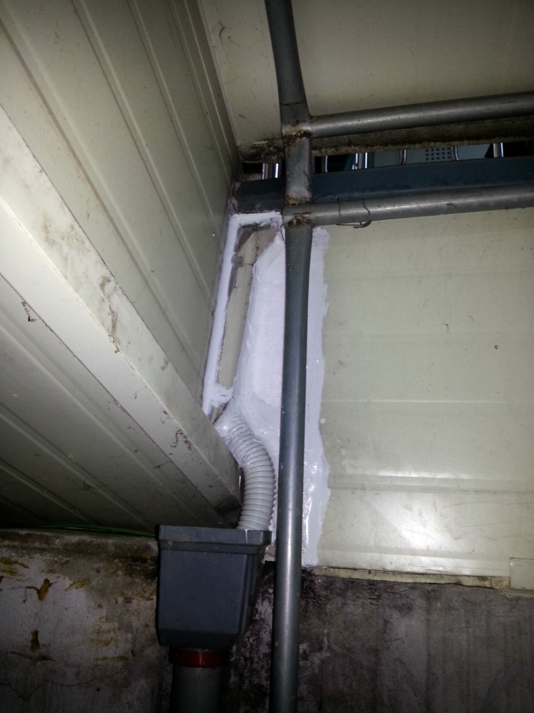 저는 최대한 돈 안들게 해달라고해서 우선은 벽을 막아야 하기때문에 철문점에 5T 짜리 스트로품을 저크기로 정확히 잘라서 뻥뚫린 벽을 막고 실리콘작업을 하였습니다 .배수관은 싱크배수관인데 한치수 큰관이 있는데 그걸로 빗물배수관으로 유도 해서 연결 했습니다.