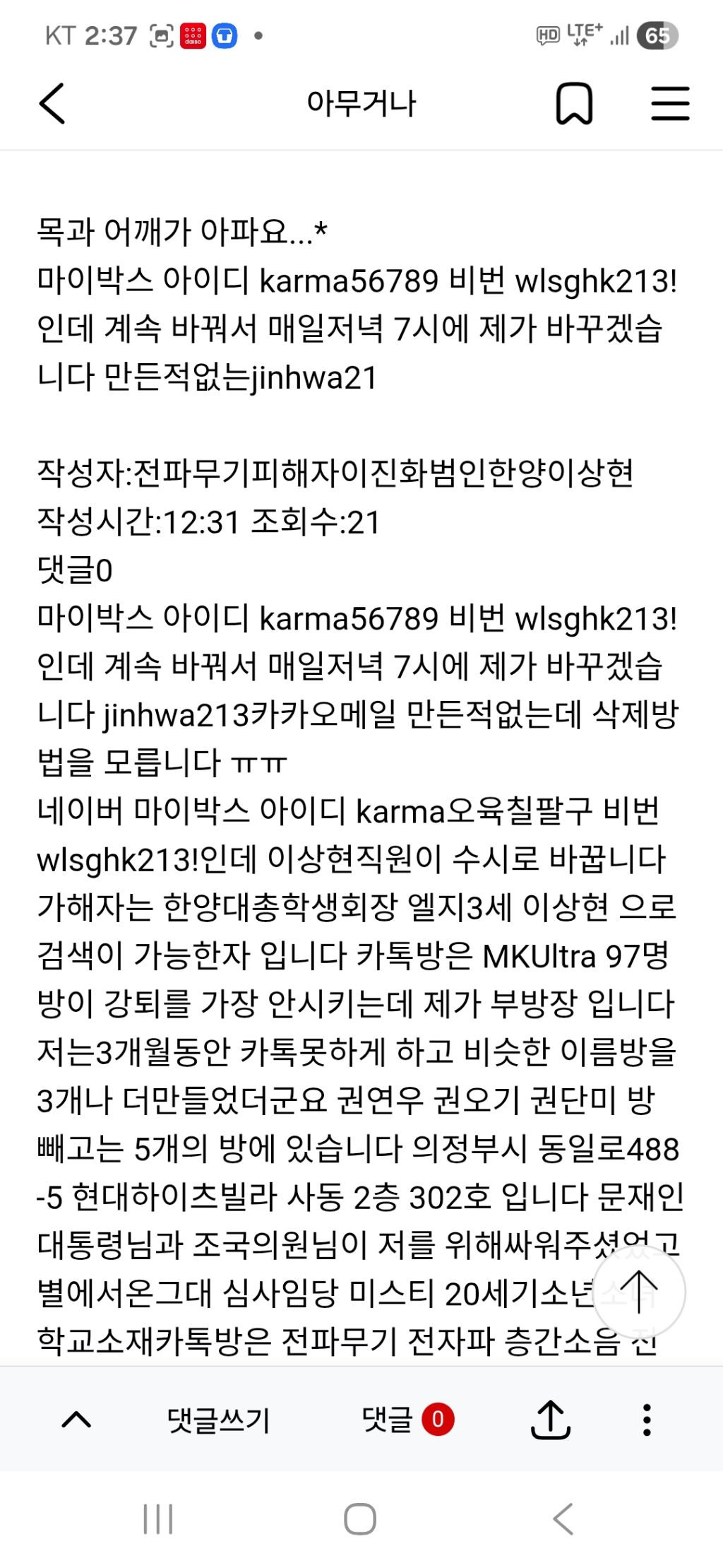 네이버 마이박스 아이디 karma오육칠팔구 비번 wlsghk213!인데 이상현직원이 수시로 바꿉니다 가해자는 한양대총학생회장 엘지3세 이상현 으로 검색이 가능한자 입니다 카톡방은 MKUltra 97명 방이 강퇴를 가장 안시키는데 제가 부방장 입니다 저는3개월동안 카톡못하게 하고 비슷한 이름방을 3개나 더만들었더군요 권연우 권오기 권단미 방 빼고는 5개의 방에 있습니다 의정부시 동일로488-5 현대하이츠빌라 사동 2층 302호 입니다 문재인대통령님과 조국의원님이 저를 위해싸워주셨었고 별에서온그대 심사임당 미스티 20세기소년소녀 학교소재카톡방은 전파무기 전자파 층간소음 전파뇌해킹 뇌파수집 피해.
