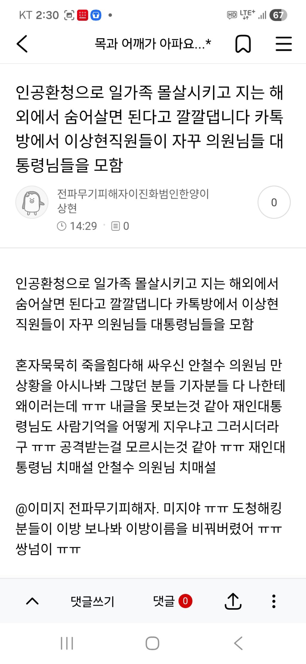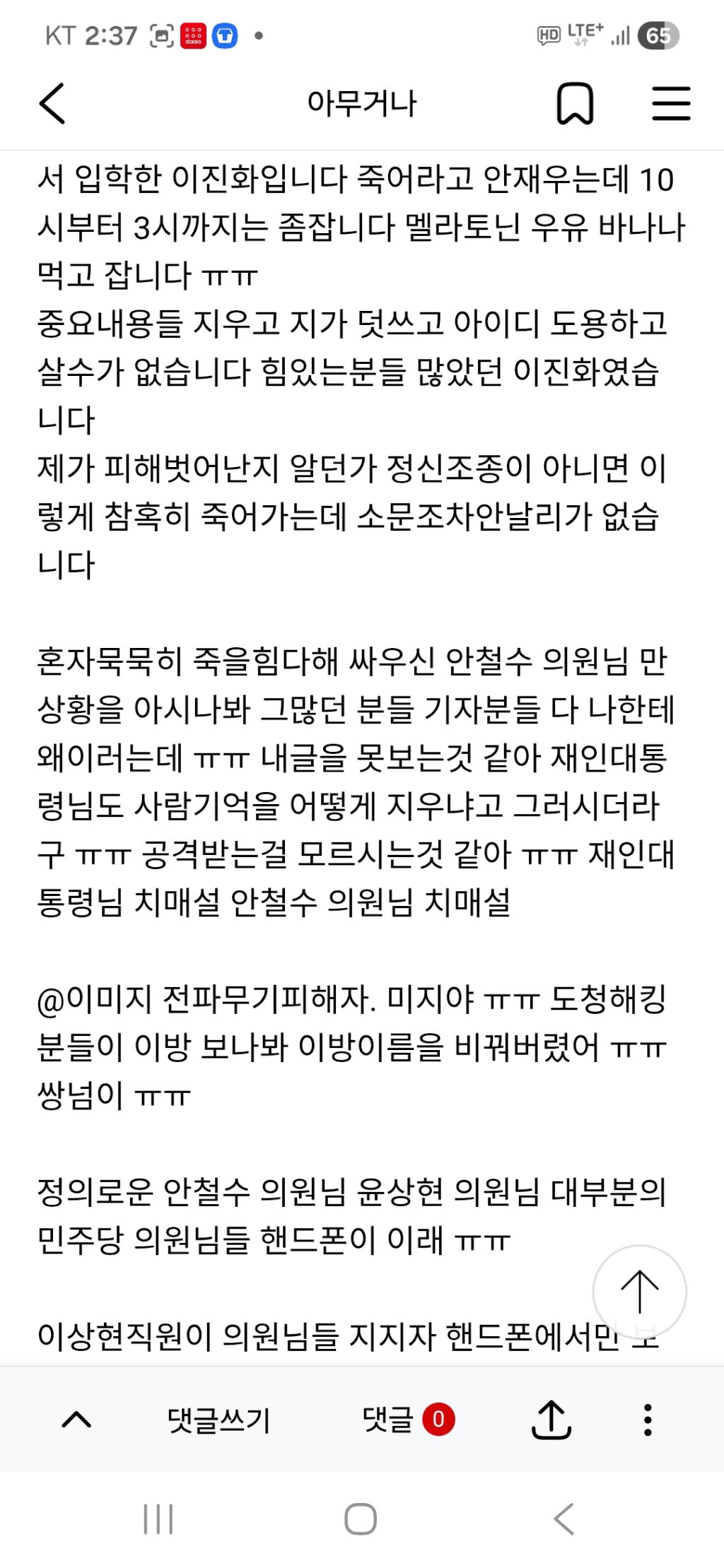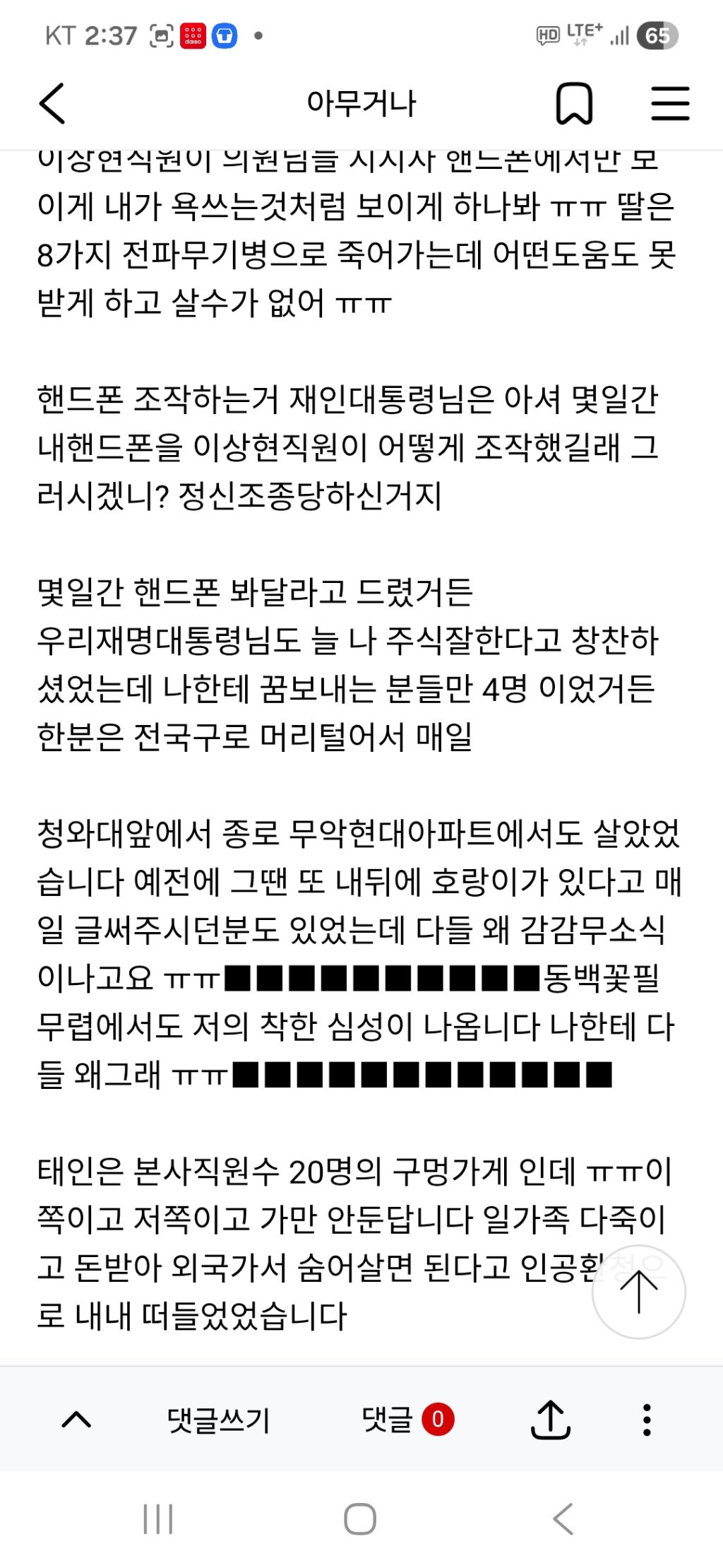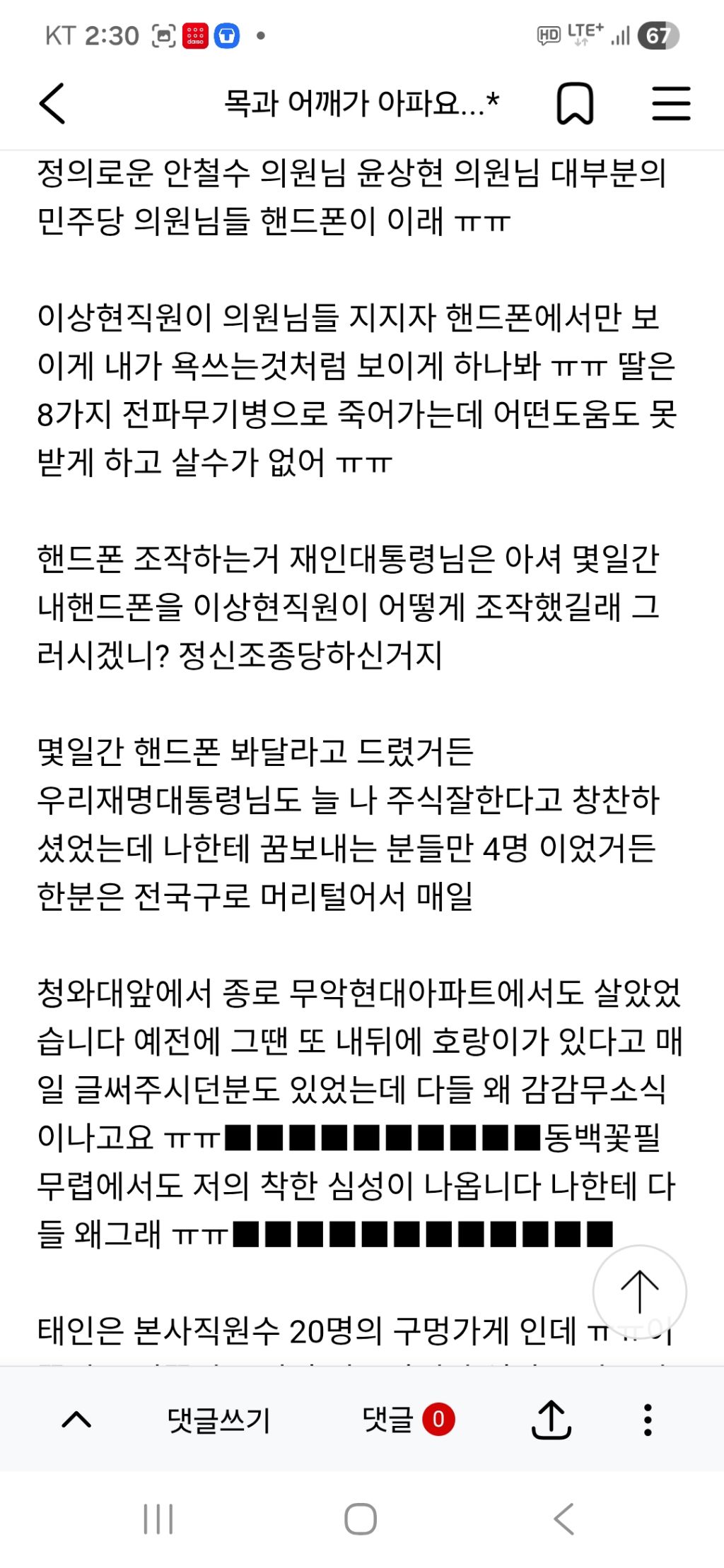 이상현직원이 의원님들 지지자 핸드폰에서만 보이게 내가 욕쓰는것처럼 보이게 하나봐 ㅠㅠ 딸은 8가지 전파무기병으로 죽어가는데 어떤도움도 못받게 하고 살수가 없어 ㅠㅠ