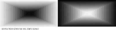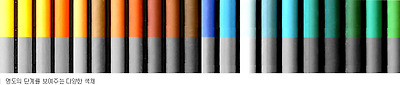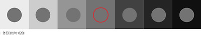 아래 그림에서 순차적으로 어두워지는 7개의 회색 면들은 서로 인접한 면들과 저명도 대비를 이루고 있습니다. 사각면 안에 있는 회색 원들은 모두가 동일한 명도를 가지고 있음에도 배경에 따라 순차적으로 밝아지는 것과 같은 효과를 보여줍니다. 명도대비의 흥미로운 착시현상입니다. 그림에서는 무채색의 7단계를 보여주지만 흰색과 검정 사이에는 무한대라고 할 수 있는 명도 단계가 존재합니다. 명도 차이가 큰 대비에서는 강렬함, 경쾌함, 활동성 등이 느껴지고 명도 차이가 작으면 편안함, 고요함, 부드러움이 느껴집니다.