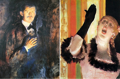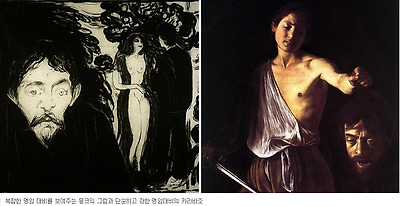 에드바르드 뭉크의 [담배를 든 자화상]은 사랑과 고통, 죽음과 불안, 우울과 허무 등을 화폭에 담았던 작가답게 어둡고 기괴한 분위기로 자신을 표현했는데 정면 아래에서 위로 비추어지는 조명에 의해 창백해 보이는 얼굴과 뒤에 형성되는 그림자와 강하게 대비되며 예민하고 불안한 작가의 내면을 표현하고 있습니다. 에드가 드가의 [장갑을 낀 여가수]는 그가 자주 출입하던 카페의 무대에서 각광을 받으며 열창하는 가수의 모습을 근접촬영을 하듯 생동감 있게 표현한 그림입니다. 검은 장갑과 목도리, 머리 뒤의 검은 베경은 화면 전체에서 가장 명도대비를 이루며 화면을 활기차게 만드는 요소인데 아래에서 위로 비추어지는 조명이 무대의 분위기를 잘 전해주고 있습니다. | |