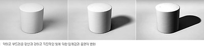| 주변의 사물은 물론이고 우리가 생활하는 실내의 천정과 벽면을 관찰하면 조명에 따라 대체로 명도가 다르다는 것을 알 수 있는데 이러한 명도차이는 우리가 공간을 지각하는데 중요한 요소로 작용합니다. 빛의 성격과 강약에 의해서도 입체감의 분위기가 다름을 알 수 있습니다. 확산되는 조명과 강하고 직진성이 강한 조명은 대상의 입체감에 많은 변화를 일으키는 조건이 됩니다. 구름에 해가 가리고 비가 오는 날의 풍경은 명암의 대비가 작아 대체로 평면적이며 단조롭고, 구름이 고르게 확산시키는 광선이 부드럽게 느껴집니다. 반면, 햇살이 강한 맑은 날 풍경은 강한 명암대비와 직진성의 빛에 의해 더욱 입체적이고 예리하며 생동감이 느껴지게 됩니다. | |