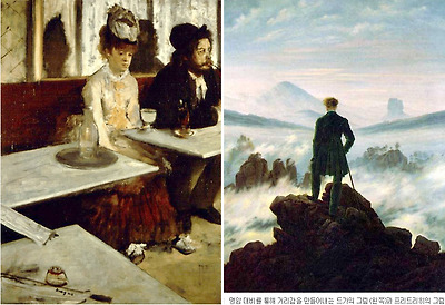 에드가 드가의 [압생트]는 싸구려 독주 압생트를 앞에 두고 침울한 표정으로 앉아 있는 여인과 무심히 담배를 피우는 남자를 통해 불편한 분위기와 생기를 잃어버린 듯한 두 사람의 관계를 드러내고 있습니다. 감상자들에게 또 다시 다양한 상상을 요구하는 흥미로운 분위기의 그림입니다. 화면에서 가장 강한 명암의 차이는 화면 맨 뒤의 남자와 여인의 주변에서 형성되는데 화면이 가장 먼 거리에 가장 큰 명도 대비가 형성되어 있습니다. 앞서 설명한 프리드리히의 그림과 상반되는 명도 대비의 구성이라 할 수 있습니다.