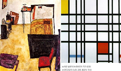 선과 면에 의한 기하학적 구성으로 절대적인 조형의 질서를 추구했던 신조형주의 작가 피에트 몬드리안의 [노랑, 파랑. 빨강의 구성]은 절제된 최소한의 색채와 수직. 수평선에 의한 구성을 보여주는데 화면을 분할하는 검은 선과 색면들은 서로 강한 명암대비를 이루며 치밀하게 짜여진 이성적 조형의 질서를 표현하고 있습니다. | |