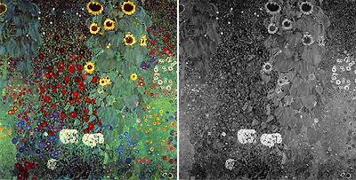 | 구스타프 클림트의 [농장의 뜰]은 정원의 꽃들을 다양한 색채로 표현한 아름답고 화려한 그림입니다. 앞마당에 이렇게 풍성한 꽃들을 가꾸며 계절을 느끼고 수많은 걸작을 남긴 클림트는 정말 행복한 화가임에 틀림없습니다. 또한 전원의 자연적 삶을 꿈꾸는 수많은 현대인들의 꿈이기도 하겠지요. 그러나 그 꿈을 잠시 미루고 다시 그림을 살펴보겠습니다. 이 멋지고 화려한 이 그림을 모노톤의 화면으로 전환해 대조해 보면 다양한 색채들이 각각 어떤 명도에 해당하는지 쉽게 파악할 수 있습니다. 해바라기 노란 꽃은 흰색보다 명도가 낮고 화면 좌측 붉은색 꽃과 보라색 꽃들은 녹색과 명도가 비슷하여 크게 구분되지 않는 것을 알 수 있습니다. 흥미롭지 않나요? | |