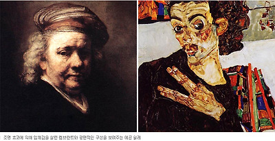 전통적인 회화가 자연스런 조명과 명암의 대비를 통해 사실적인 입체감을 추구해 왔다면 사진 발명 이후 많은 화가들은 사실 재현에서 벗어나 자유롭고 다양한 회화적 표현양식을 선보이며 전통적인 입체표현이나 고유색, 공간표현 등에서 벗어나기 사직했습니다. 두 자화상 모두 작가의 내밀한 세계를 엿볼 수 있지만 입체적 효과에 있어서는 확연히 다른 표현형식으로 구분됩니다. 시대를 뛰어넘어 미술의 역사상 위대한 노대가의 중후함과 젊은 천재의 재기 넘치는 표현을 자화상을 통해 비교해 보는 것도 흥미로운 일입니다. 어느 작가가 더 매력적으로 느껴지는지요?