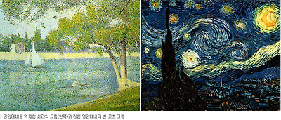 신인상주의 대표 화가인 쇠라의 [그랑자트에서 바라 본 세느강]은 점묘기법을 통해 찬란한 빛과 영롱한 색채의 어우러짐으로 강변의 풍경을 표현한 작품입니다. 빛의 스펙트럼과 색채의 가산혼합을 연구하고 회화표현의 양식으로 발전시켰던 쇠라는 사물의 명료한 형태나 입체감, 공간감 보다 빛과 색채의 조화에서 오는 감흥에 우선하여 저명도 대비의 밝고 화사하며 평면적인 화면 구성을 보여주고 있습니다. 반면, 반 고흐의 [별이 빛나는 밤](부분)에서는 떨리듯 빛을 방사하는 별과 휘감아 도는 대기의 움직임, 전경의 나무와 멀리 보이는 시가지 등이 강한 명암대비를 이루어 끊임없이 생동하는 밤의 분위기와 작가의 격정적인 내면을 보여주고 있습니다.