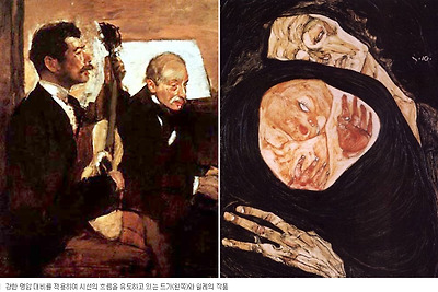 에곤 쉴레의 그림 [어머니의 죽음](부분)에서는 크게 세 부분으로 구분되는 극단적인 명암 대조의 화면구성입니다. 죽어가는 어머니와 새로운 생명의 상징인 자궁 속 태아와 같은 아이, 그리고 그 인연의 끈을 놓지 못하고 아이를 감싸 안은 어머니의 손이 모성을 통한 삶과 죽음의 고뇌를 드러내고 있습니다. 쉴레의 놀랍도록 감각적이고 대담한 화면구성, 극적인 정서를 느끼게 하는 걸작입니다.