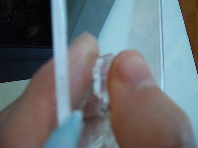 10. 왼손의 포지션이 잡히면 오른손으로 아크릴 칼을 잡고 사진과 같이 제일 뾰족하고 날카로운 끝부분을 이용해서