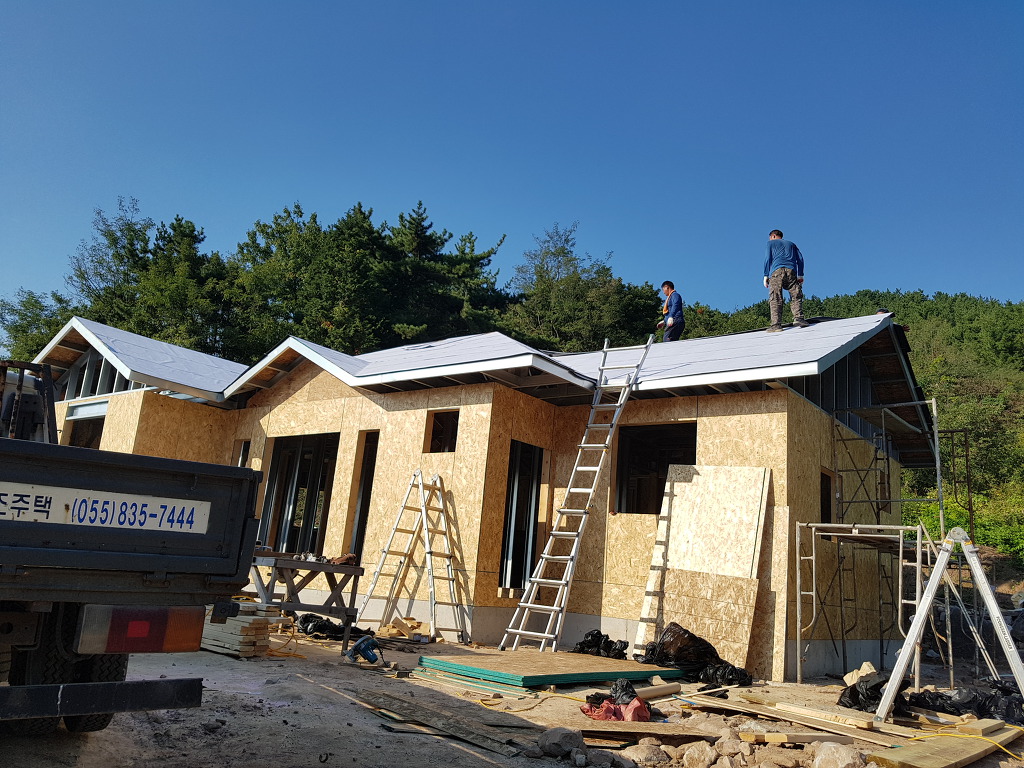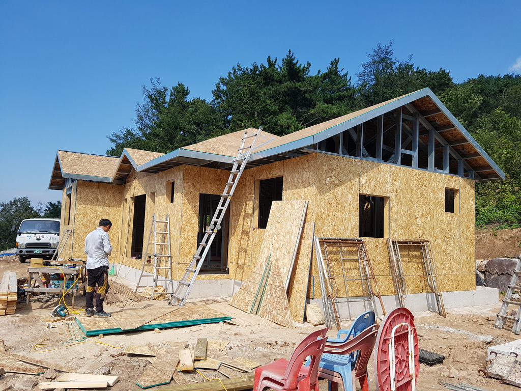 지붕에 OSB합판을 설치하고  지붕마감재 싱글로 마감하기 전