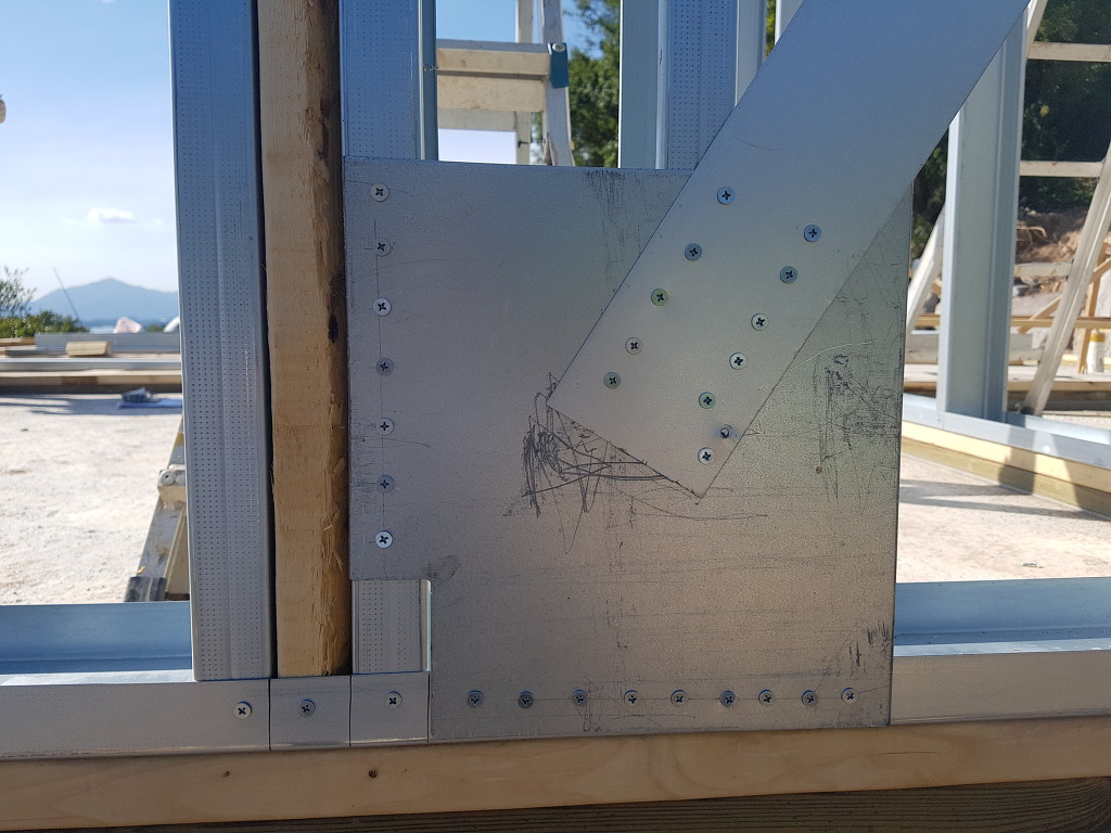 설치만 되어 있지만 여기에는 많은 스크류볼트로 고정접합을 하여 각 모서리마다 설치함으로 전단벽 하부의 전도력을