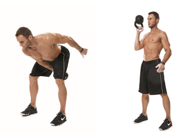 2. 케틀벨이 다리 사이를 통과하도록 엉덩이를 뒤로 뺐다가 엉덩이를 앞으로 밀며 위로 힘차게 들자. 팔도 따라서 휘둘렀다가 90도로 굽혀서 케틀벨을 거꾸로 받자. 코어를 쥐어짜며 1~2초 케틀벨을 들고 있자