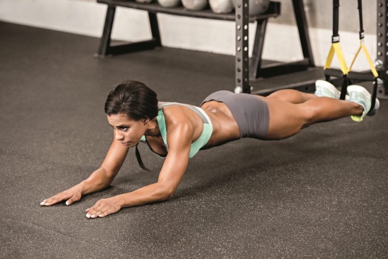 플랭크 자세를 취하자. 팔뚝은 바닥에 대고, 팔꿈치는 어깨 바로 밑에 오게 하고, 발등은 서스펜션 스트랩 손잡이에 올리자. 코어를 조인 상태에서 몸을 앞으로 5~7cm 밀어서 어깨가 팔꿈치를 살짝 지나게 만들자(A).